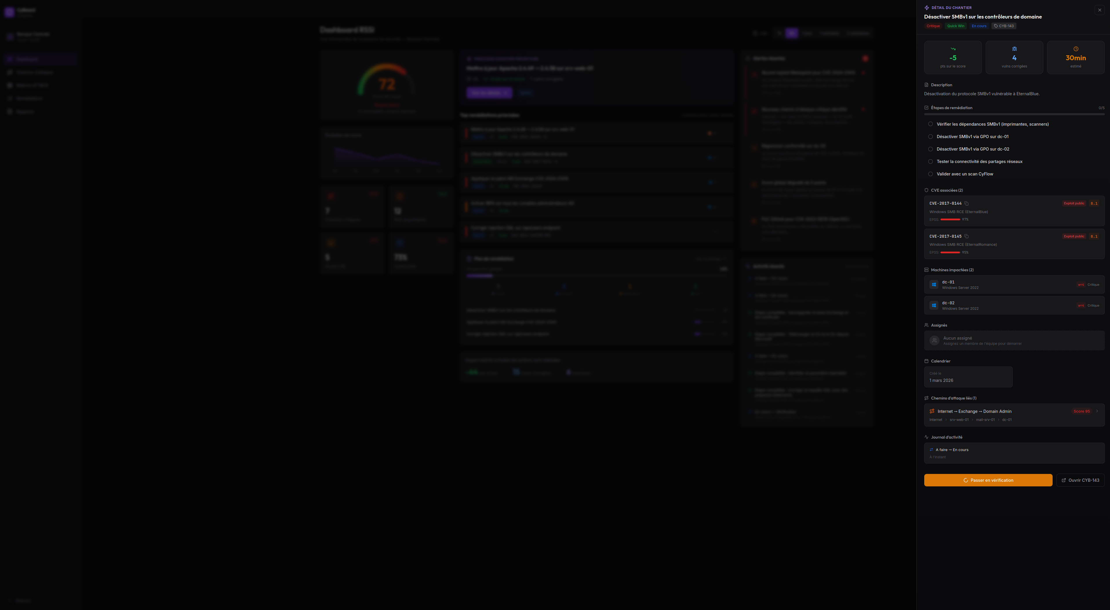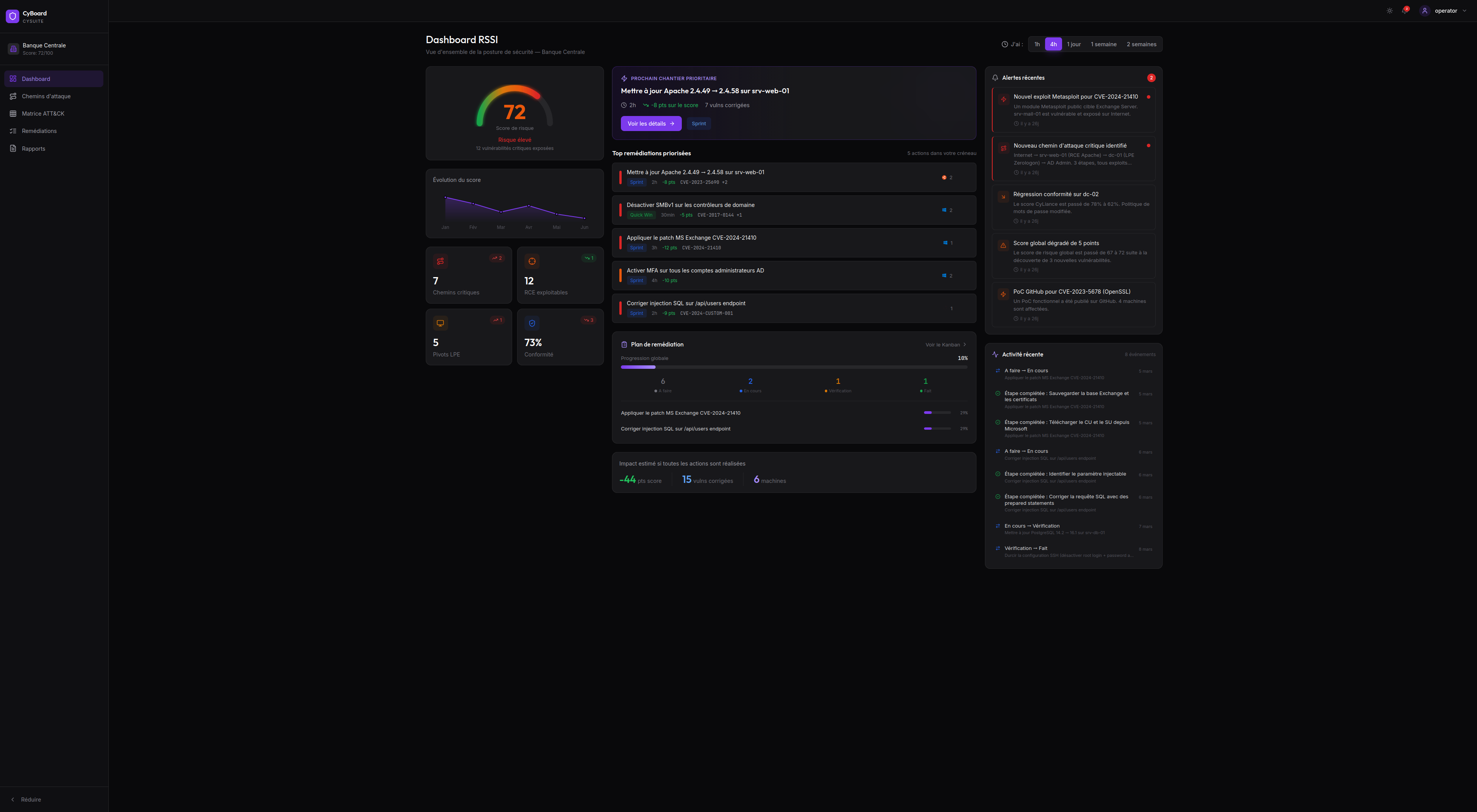 CyBoard agrège l'intelligence de l'ensemble de la plateforme Lagarde Cyber pour identifier les chemins d'attaque les plus critiques de votre infrastructure. Au lieu de vous submerger d'alertes, CyBoard calcule un score de risque composé (Impact × Exploitabilité × Accessibilité × Durcissement) et filtre les remédiations selon votre disponibilité réelle. Que vous ayez 1 heure ou 2 semaines, CyBoard vous montre exactement quoi faire en premier.