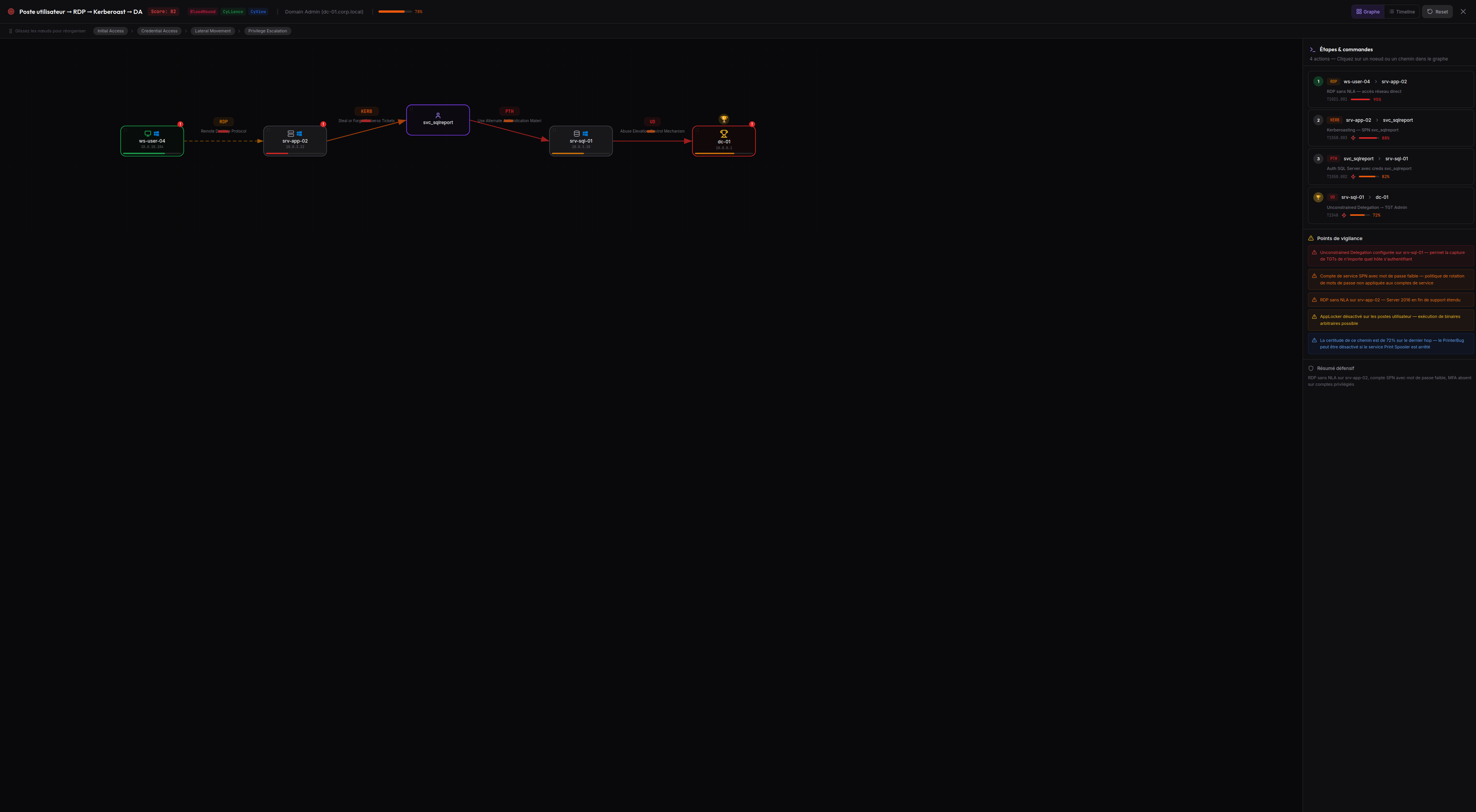 Identification automatique des chaînes de compromission : surface exposée → vulnérabilité exploitable → mouvement latéral (RCE/LPE) → objectif. Visualisation en graphe interactif.