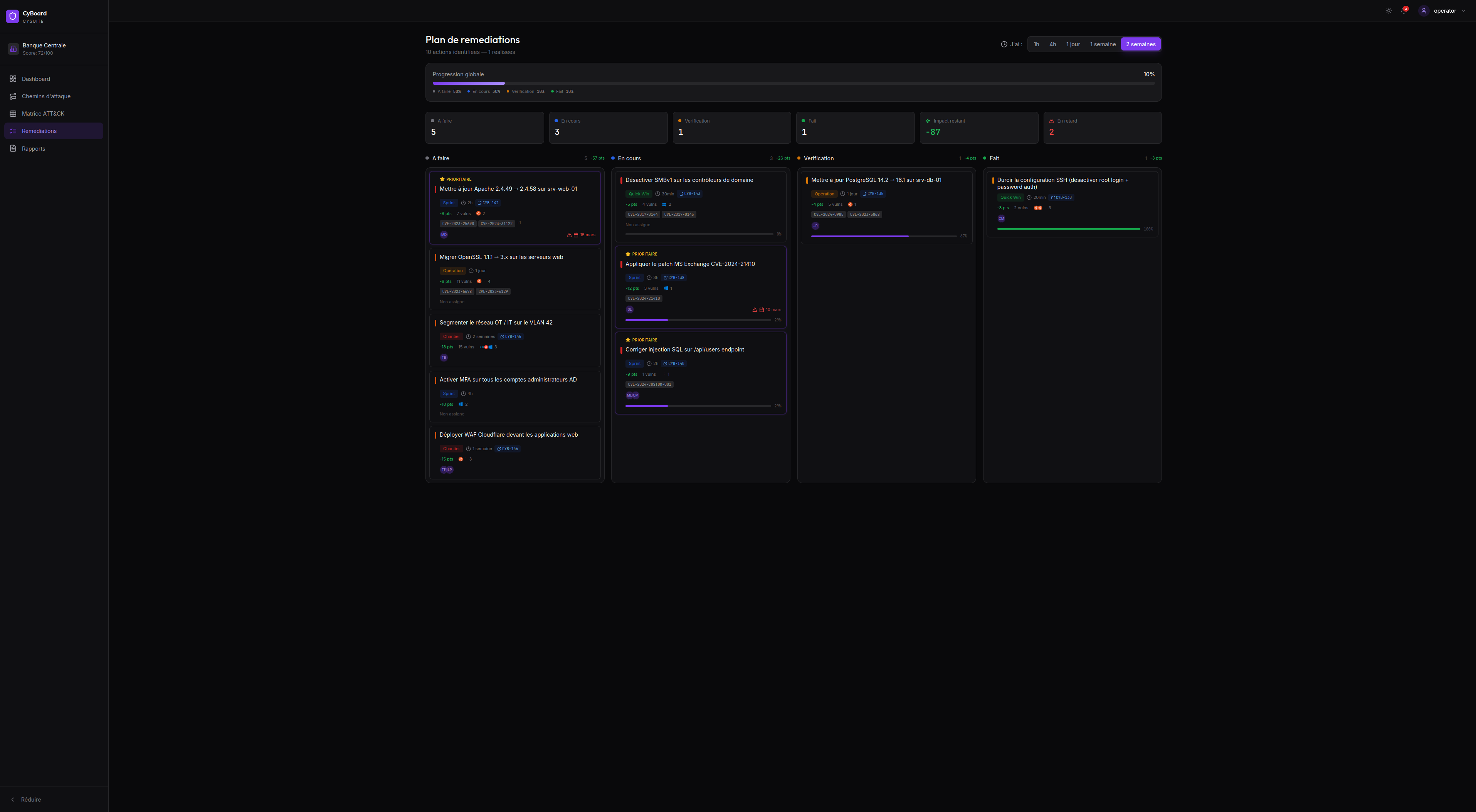 Fonctionnalité unique : indiquez votre temps disponible et CyBoard filtre automatiquement les remédiations réalisables. Quick Wins en moins d'1h, Sprint en 4h, Opération en 2 jours, Chantier en 2 semaines.