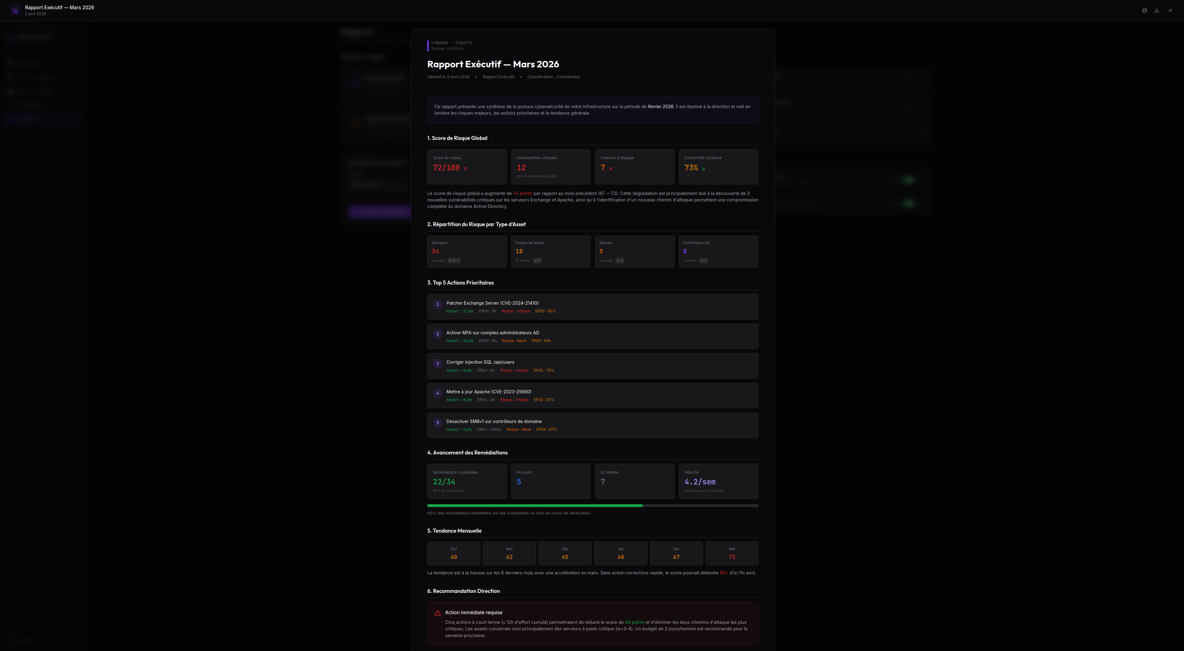 Rapports exécutifs pour la direction et techniques pour les équipes opérationnelles. Alertes contextuelles déclenchées uniquement quand un chemin d'attaque critique évolue.
