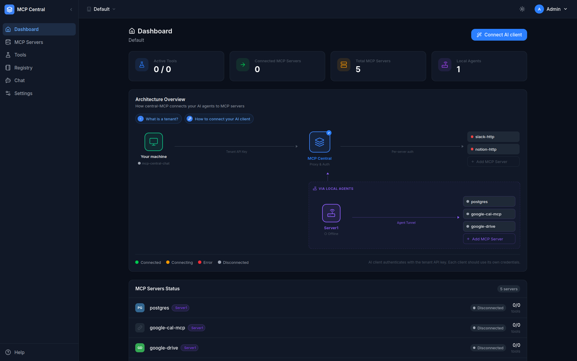MCP Central est la colonne vertébrale de notre architecture IA. Cette technologie unique de centralisation des serveurs MCP (Model Context Protocol) orchestre l'ensemble de nos agents spécialisés — et elle est disponible gratuitement pour tous. Chaque produit Lagarde Cyber communique via des agents MCP pilotés et orchestrés par MCP Central, permettant une interopérabilité native et une extensibilité infinie. Utilisez MCP Central pour bâtir facilement les architectures logicielles de demain, basées sur l'IA.